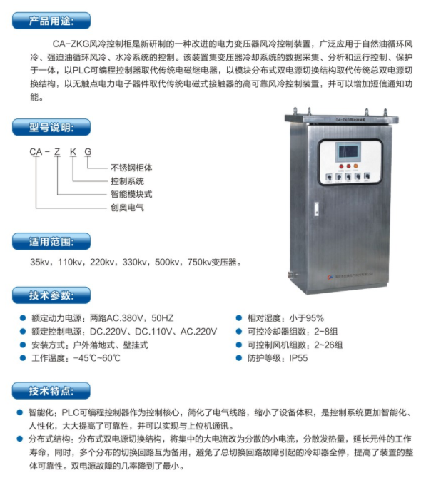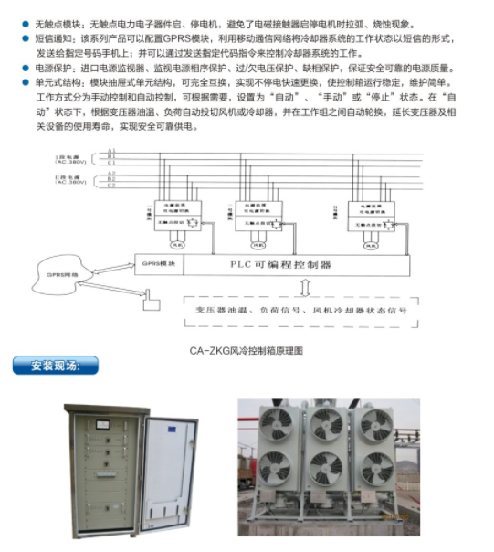 • CA 一 ZKG 風冷控制箱 CA 一 ZKG 風冷控制拒是新研制的一種改進的電力變壓器風冷控制裝置,廣泛應用于自然油循環風冷、強迫油循環風冷、水冷系統的控制。該裝置集變壓器冷卻系統的數據采集、分析和運行控制、保護于一體,以 pLC 可編程控制器取代傳統電磁繼電器,以模塊分布式雙電源切換結構取代傳統總雙電源切換結構,以無觸點電力電子器件取代傳統電磁式接觸器的高可靠風冷控制裝置,并可以增加短信通知...
